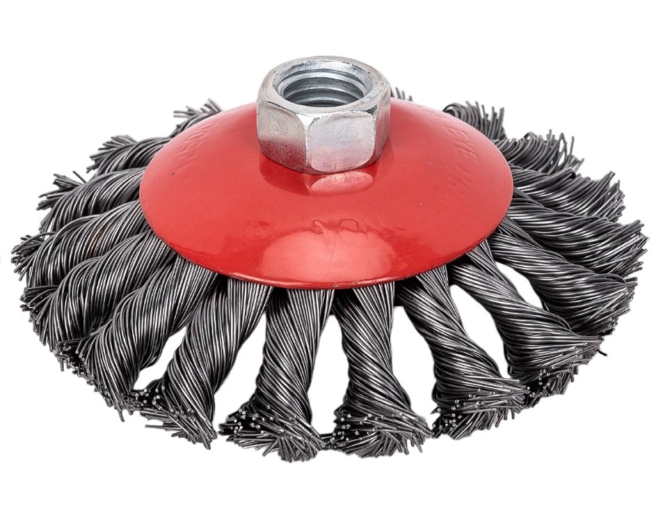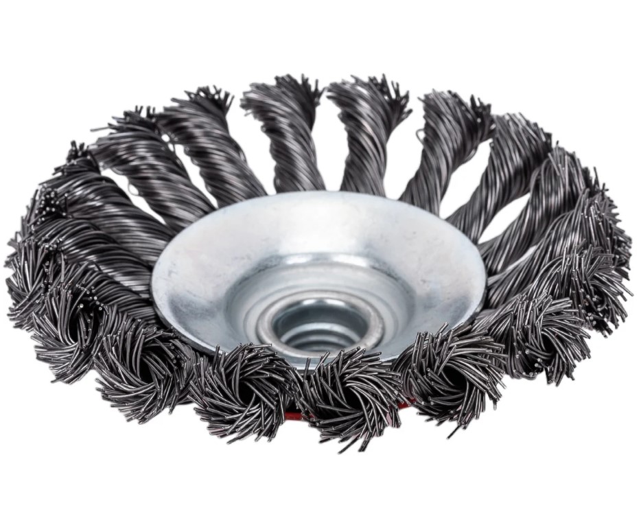 Щётка-крацовка дисковая (витая стальная проволока, посадочная гайка М14, диаметр 100 мм) предназначена для грубой очистки металлических поверхностей от ржавчины, грязи, удаления лакокрасочных покрытий и зачистки сварных швов. Также может использоваться для работы по бетону, дереву, камню, кирпичу и плитке. Плоская форма щётки позволяет вести обработку в углах, изгибах и других труднодоступных местах.