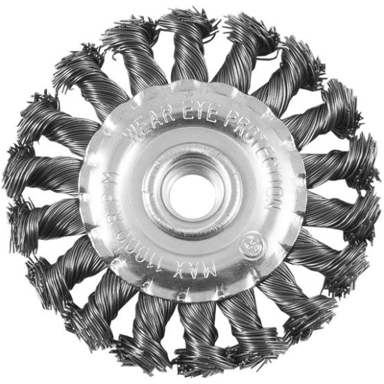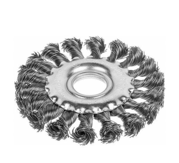 Щётка-крацовка дисковая (витая стальная проволока, посадочная гайка М14, диаметр 150 мм) предназначена для грубой очистки металлических поверхностей от ржавчины, грязи, удаления лакокрасочных покрытий и зачистки сварных швов. Также может использоваться для работы по бетону, дереву, камню, кирпичу и плитке. Плоская форма щётки позволяет вести обработку в углах, изгибах и других труднодоступных местах.