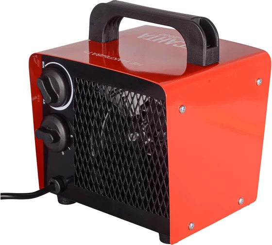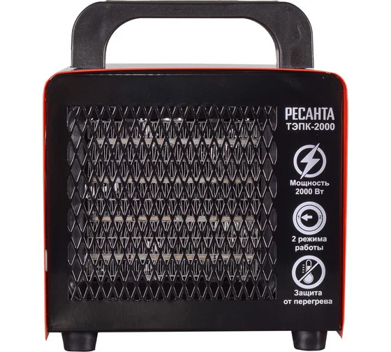 Обогреть гараж, уютный дачный дом или помещение другого назначения можно посредством использования электрической тепловой пушки модели Ресанта ТЭПК-2000. Теплопушка оснащена керамическим нагревателем и работает на двух мощностях – 1кВт и 2кВт. Корпус тепловой пушки выполнен из металла и оснащён широкой пластиковой ручкой. Модель Ресанта ТЭПК-2000 имеет квадратную форму, отличается компактными и небольшим весом – 1.73 кг. В основании агрегата имеются прорезиненные ножки, исключающие скольжение устройства на гладких напольных покрытиях. Нагревательный элемент надёжно защищён металлической сеткой, расположенной с фронтальной стороны. В тыльную часть вынесены 5-лопастной вентилятор и блок управления, включающий переключатель режимов работы и регулятор скорости вращения вентилятора. За счёт компактных габаритов электрическая пушка быстро выходит на максимальный режим нагрева и обладает хорошей теплоотдачей. В приборе установлена система термозащиты, которая отключает его в случае перегрева. Работает агрегат от бытовой сети 220 Вт, 50 Гц.