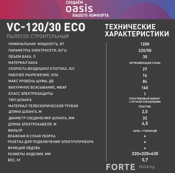 Строительный пылесос Oasis Eco VC-120/30 Eco — это мощное и универсальное устройство для сухой и влажной уборки. Благодаря HEPA-фильтру, он обеспечивает высокое качество очистки воздуха от пыли и аллергенов, делая его безопасным для дыхания. Удобство в работе. Пылесос обладает высокой производительностью и эффективностью благодаря мощности 1200 Вт и скорости воздушного потока 27 л/с. Вместительный бак из нержавеющей стали объёмом 30 литров подходит для интенсивной работы, благодаря тому, что его надо реже опустошать. Встроенная штепсельная розетка на корпусе позволяет подключать электроинструменты, что делает рабочий процесс более гибким и удобным. Комфорт и безопасность. Пылесос удобен в использовании благодаря регулируемой рукоятке, которая настраивается под индивидуальные потребности пользователя. В комплект входит губчатый фильтр для влажной уборки. Прибор может всасывать небольшое количество воды. Бак из нержавеющей стали не боится коррозии.