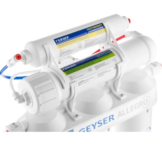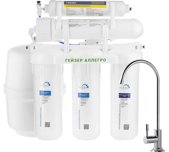 Технология обратного осмоса, использованная в фильтре Гейзер Аллегро, заключается в фильтрации воды через полупроницаемую мембрану. Размеры пор мембраны настолько малы, что пропускают только молекулы воды. Размер молекул большинства примесей, а также бактерий и вирусов значительно больше молекул воды, поэтому они не проходят через мембрану. Система работает при давлении в подводящей магистрали не менее 3 атм. Максимальный объем очищенной воды 7.5 л.; Специальный клапан для сброса воды в дренаж при превышении давления в баке выше 4 атм.; Двойное уплотнение колб; Выдерживает давление до 25 атм., не менее 100 000 циклов гидроудара. Протестирован в НИИ Точной Механики; Все необходимое для подключения в комплекте. ЭТАПЫ ОЧИСТКИ ВОДЫ СИСТЕМОЙ ОБРАТНОГО ОСМОСА ГЕЙЗЕР АЛЛЕГРО: Предварительная очистка (подготовка воды для увеличения срока службы мембраны): осадочные картриджи РР 5 - 10SL (1 и 3 ступени) — удаляют нерастворимые частицы размером до 5 мкм (ржавчина, взвеси) - 2 шт.; 2 ступень: CBC 10 - 10SL — карбон-блок из высококачественного кокосового активированного угля пористостью 10 мкм. - 1 шт. Ресурс 6 – 12 месяцев в зависимости от качества воды. Обратноосмотическая мембрана Geyser 1812-50 GPD — удаление всех примесей, включая бактерии и вирусы. Ресурс 1 – 3 года (зависит от качества воды). Угольный постфильтр (активированный уголь) — улучшает вкусовые качества воды. Ресурс 12 месяцев.