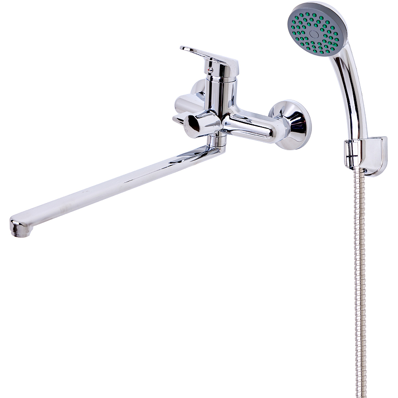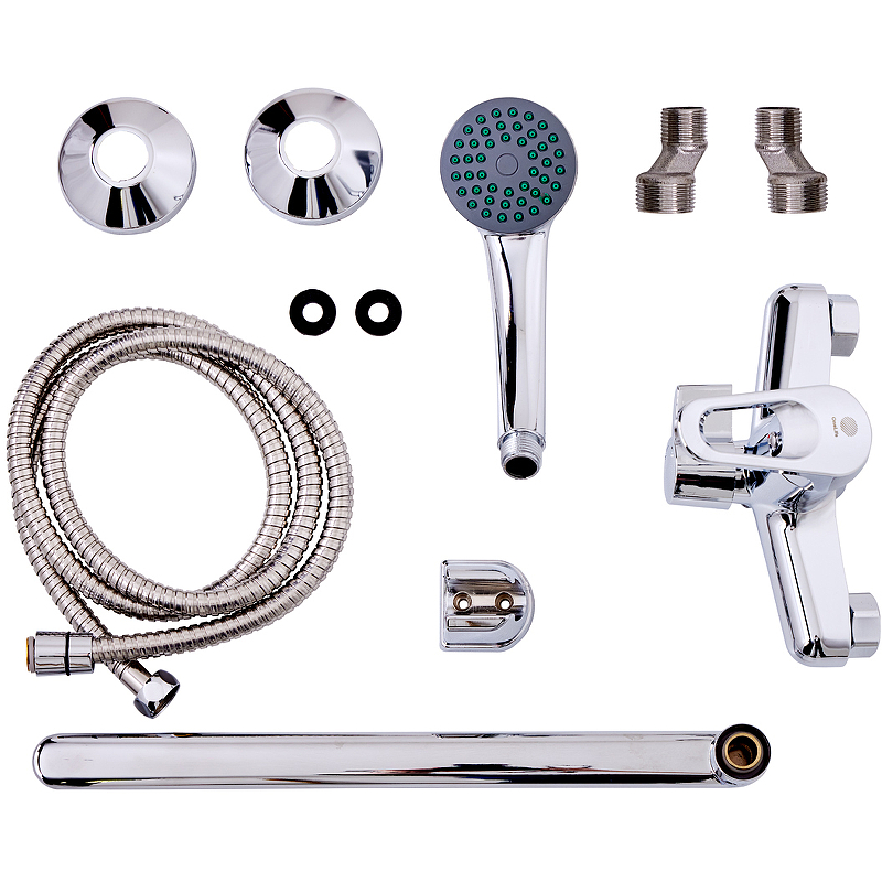 смеситель, душевая лейка, держатель лейки, душевой шланг, два отражателя, эксцентрик и инструкция