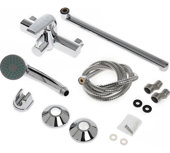 смеситель, душевая лейка, держатель лейки, душевой шланг, отражатели, эксцентрики и инструкция по установке