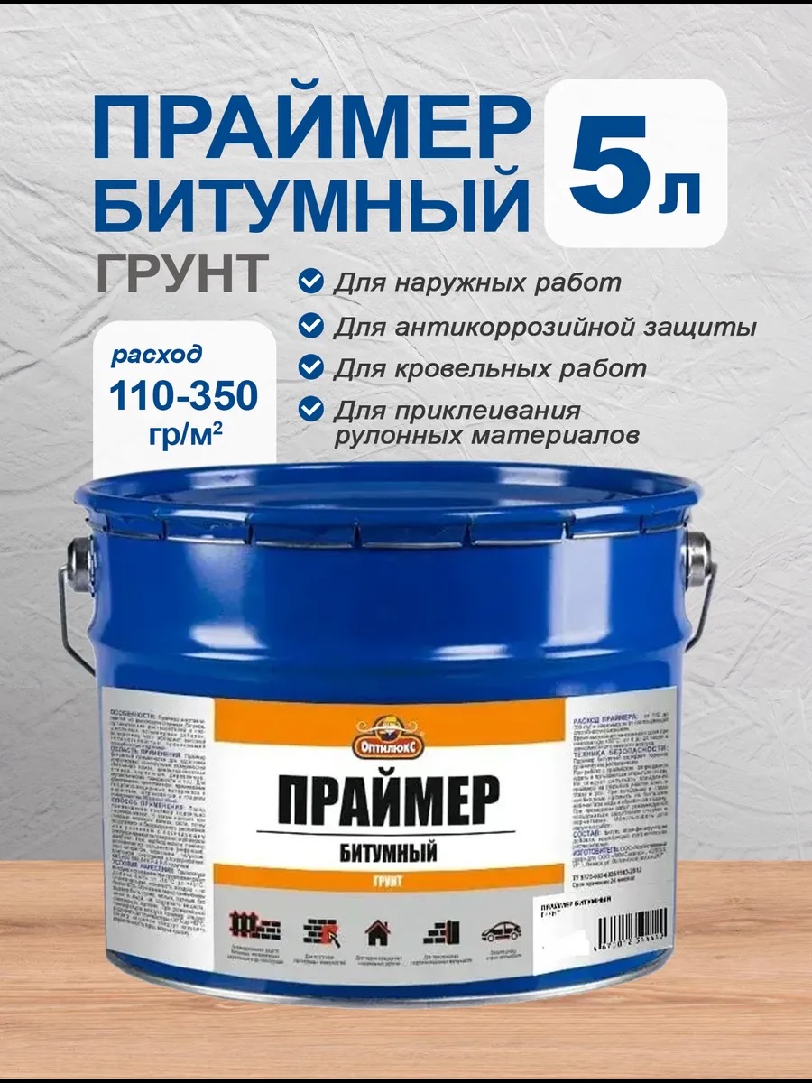Праймер, грунт битумный OPTILUX (ОПТИЛЮКС), 5 л в банке Применяется для подготовки (огрунтовки) изолируемых поверхностей (бетонная плита, цементно-песчаная стяжка, деревянные, металлические поверхности и т.п.). Для обеспечения качественного приклеивания гидроизоляционных материалов к пористым, шероховатым и гладким поверхностям. - Изготовлен из высококачественных битумов, органических растворителей, специальных полимерных добавок; - обладает высокой теплостойкостью, проникающей способностью и адгезией; морозостойкий. Перед применением праймер тщательно перемешивают, при необходимости праймер разбавляют сольвентом (нефрасом), уайт-спиритом, керосином или аналогичными растворителями. Основание перед применением должно быть сухим, чистым, прочным, без инея и льда, не содержать веществ, снижающих адгезию. Праймер наносят при помощи мехового валика, кисти путем воздушного и безвоздушного распыления или разливом с последующим распределением по поверхности резиновой шваброй. Температура воздуха и основания при проведении работ должна быть от -10°С до +40°С, относительная влажность воздуха - не более 80%. При температуре воздуха ниже -10°С праймер следует разогреть. Расход: 110-350 г/м² при нанесении в 1 слой в зависимости от поглощающей способности основания. Время высыхания одного слоя при температуре 20°С от 6 до 24 часов в зависимости от влажности воздуха.