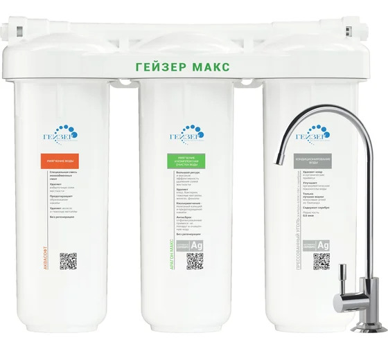 Трехступенчатый фильтр Гейзер Макс 16024 служит для максимального умягчения воды при помощи сочетания свойств специальной ионообменной смолы в картриджах AquaSoft и Арагона МАКС. Фильтр прост в установке, выполнен из непрозрачного пищевого пластика. Изделие с тремя ступенями очистки очищает воду от железа - 92%, хлора – 99,9%, меди – 97%, цветности, запахов и привкусов – 100%.