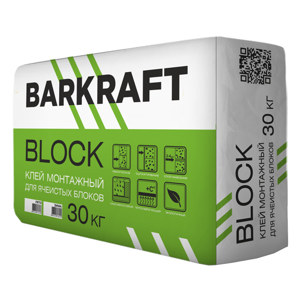 BARKRAFT Клей для ячееистых блоков "BLOCK" 30 кг ОБЛАСТЬ ПРИМЕНЕНИЯ Применяется при возведении: ✓стен и перегородок ✓монтажа блоков из ячеистого бетона (газобетона, пенобетона, силикатного кирпича, шлакоблоков) ✓других высокопористых материалов, обладающих повышенным влагопоглащением Позволяет получить тонкие швы между блоками (плитами), что предотвращает образование «мостиков холода» и делает теплоизоляцию конструкции более эффективной Обладает повышенной адгезией к основанию и высокой водоудерживающей способностью Может применяться для выравнивания поверхностей из пористых материалов и приклеивания керамической плитки на несложные основания (цементная штукатурка, кирпич) Для внутренних и наружных работ