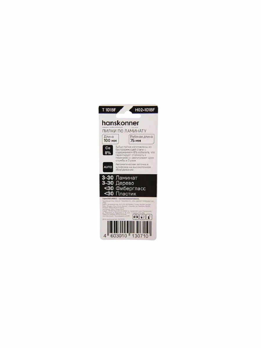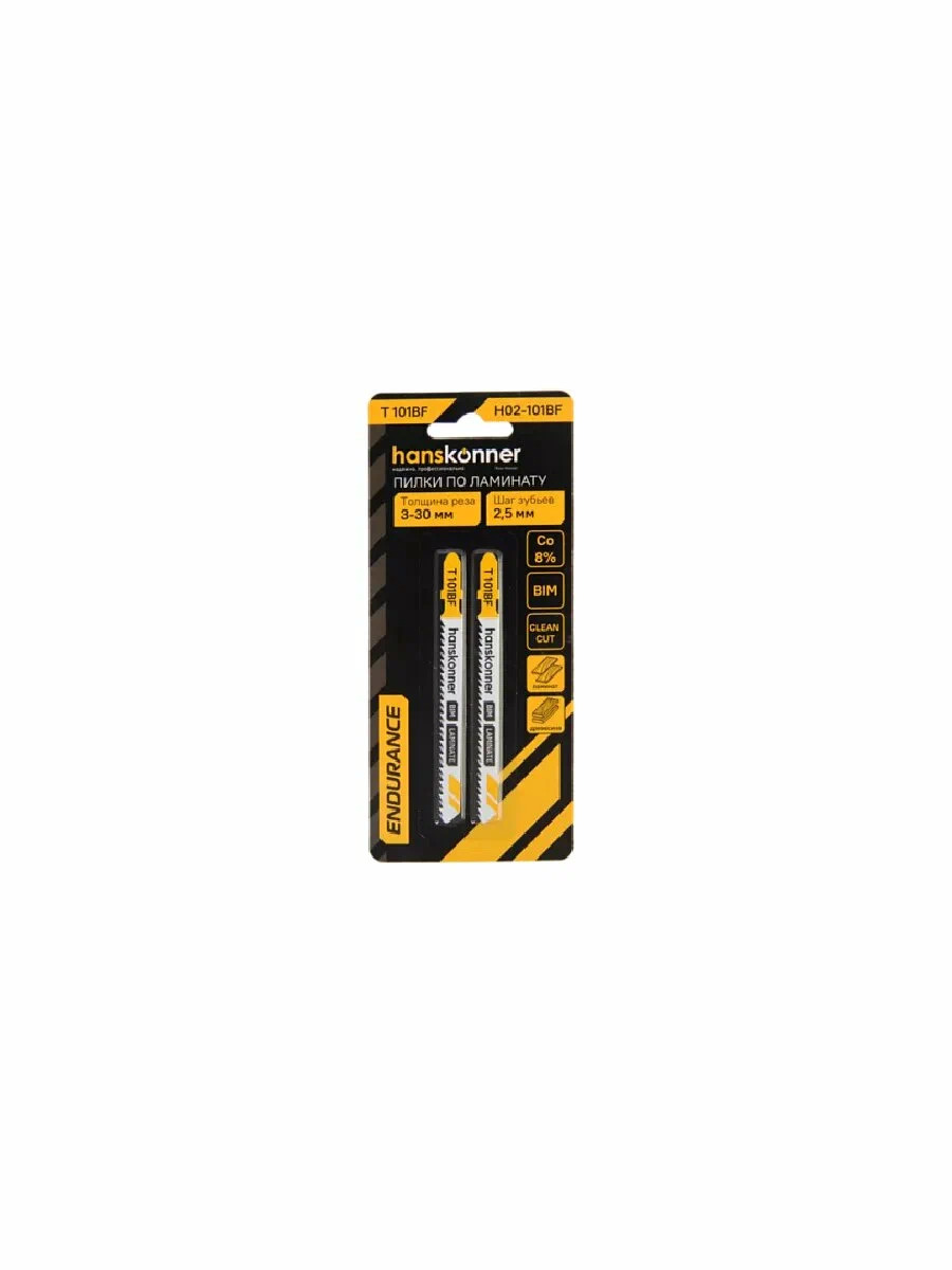 Пилки для лобзика Hanskonner H02-101BF - Предназначены для чистого распила ламината, твердой древесины, стеклопластика, толщина которых не более 30 мм. Co8% - режущие зубья изготовлены из быстрорежущей стали с содержанием 8% кобальта, что гарантирует стойкость к перегреву и увеличивает срок службы в 2 раза. AUTO - автоматическая заточка и шлифовка на высокоточном оборудовании. Характеристики: Длина полотна: 100 мм. Шаг зубьев: 2,5. Материал: BIM. Исполнение зуба: Шлифованные неразведенные. Рабочая длина: 75 мм. Обрабатываемый материал: Ламинированные ДСП 3-30 мм, дерево 3-30 мм, фибергласс до 30 мм, пластик до 30 мм. Тип пилки: T101BF. Комплектация: Пилки - 2 шт.