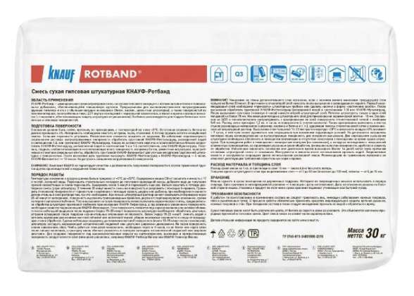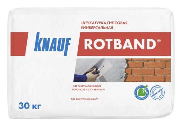 Универсальная гипсовая штукатурка Knauf Ротбанд предназначена для внутренних работ: она используется для чернового выравнивания стен. Она подходит для нанесения на различные основания, в том числе кирпичную кладку, бетон, газобетон, пазогребневые блоки. Сухая смесь на основе природного гипсового связующего образует пластичный раствор, который легко распределяется и выравнивается по поверхности. Благодаря продолжительному высыханию его можно распределить максимально равномерно вплоть по получения глянцевой поверхности. Серая штукатурная смесь рассчитана на нанесение с толщиной слоя до 27,5 мм, толщина будет зависеть от ровности основания. При приготовлении раствора соблюдайте инструкцию производителя, чтобы получить требуемую консистенцию для быстрого и равномерного нанесения. Смесь рассчитана на ручное применение.