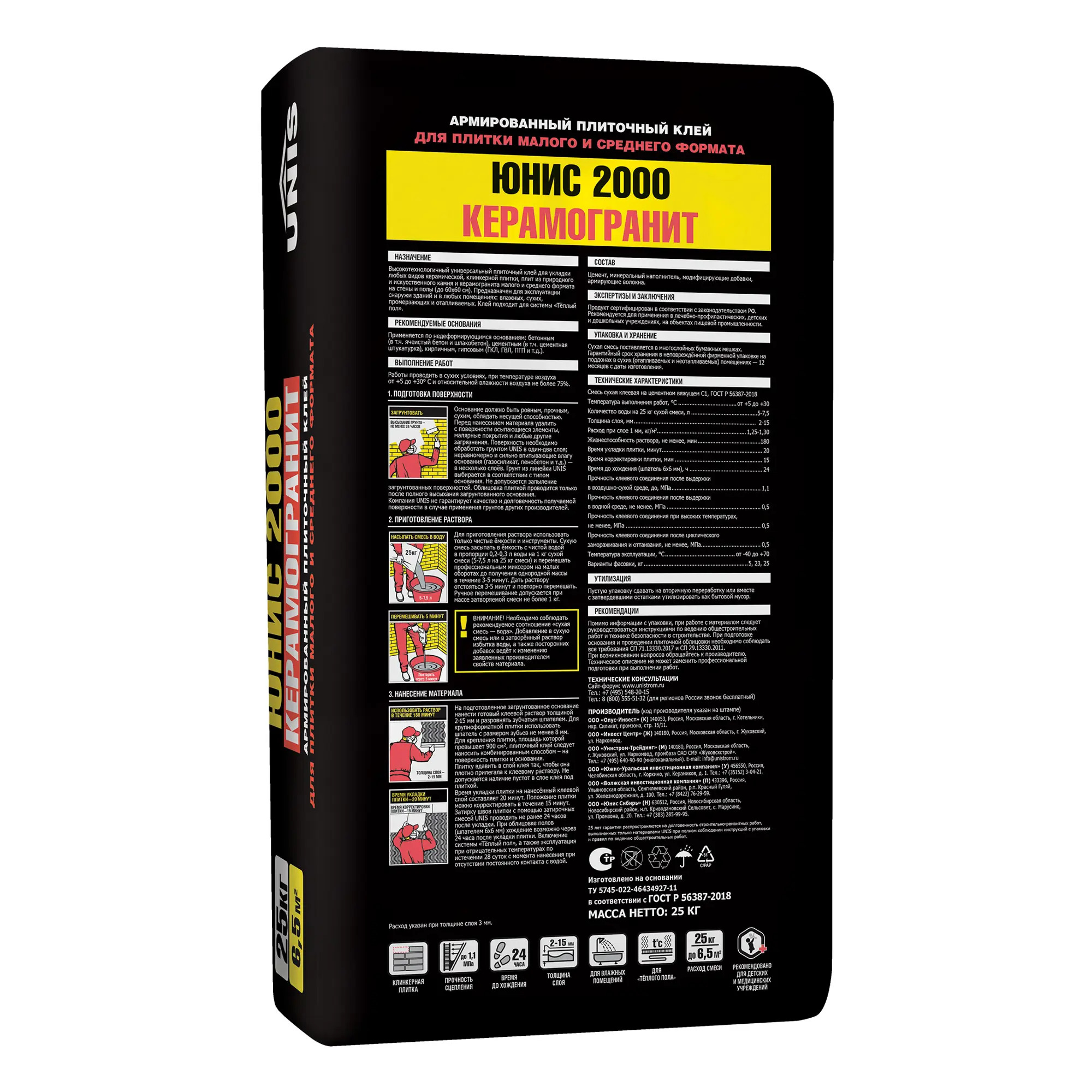 Клей для плитки Unis 2000 - высокотехнологичный универсальный плиточный клей для укладки любых видов керамической, клинкерной плитки, плит из природного и искусственного камня и керамогранита малого и среднего формата на стены и полы (до 60х60 см). Предназначен для эксплуатации снаружи зданий и в любых помещениях: влажных, сухих, промерзающих и отапливаемых. Клей подходит для системы «Тёплый пол». При производстве применяется система армирования FST (Fiber System Technology) - это уникальная система армирующих волокон, которая в зависимости от типа состава и выполняемых задач, подбирается индивидуально. Армирующие волокна позволяют снизить риск образования трещин в материале на этапах твердения и эксплуатации. Армированные продукты идеальное решение: для новостроек, подверженных осадке; для строений, находящихся рядом с магистралями и другими местами с усиленной вибрационной нагрузкой. Температура выполнения работ - от +5 до +30 °С Температура эксплуатации - от -40 до +70 °С