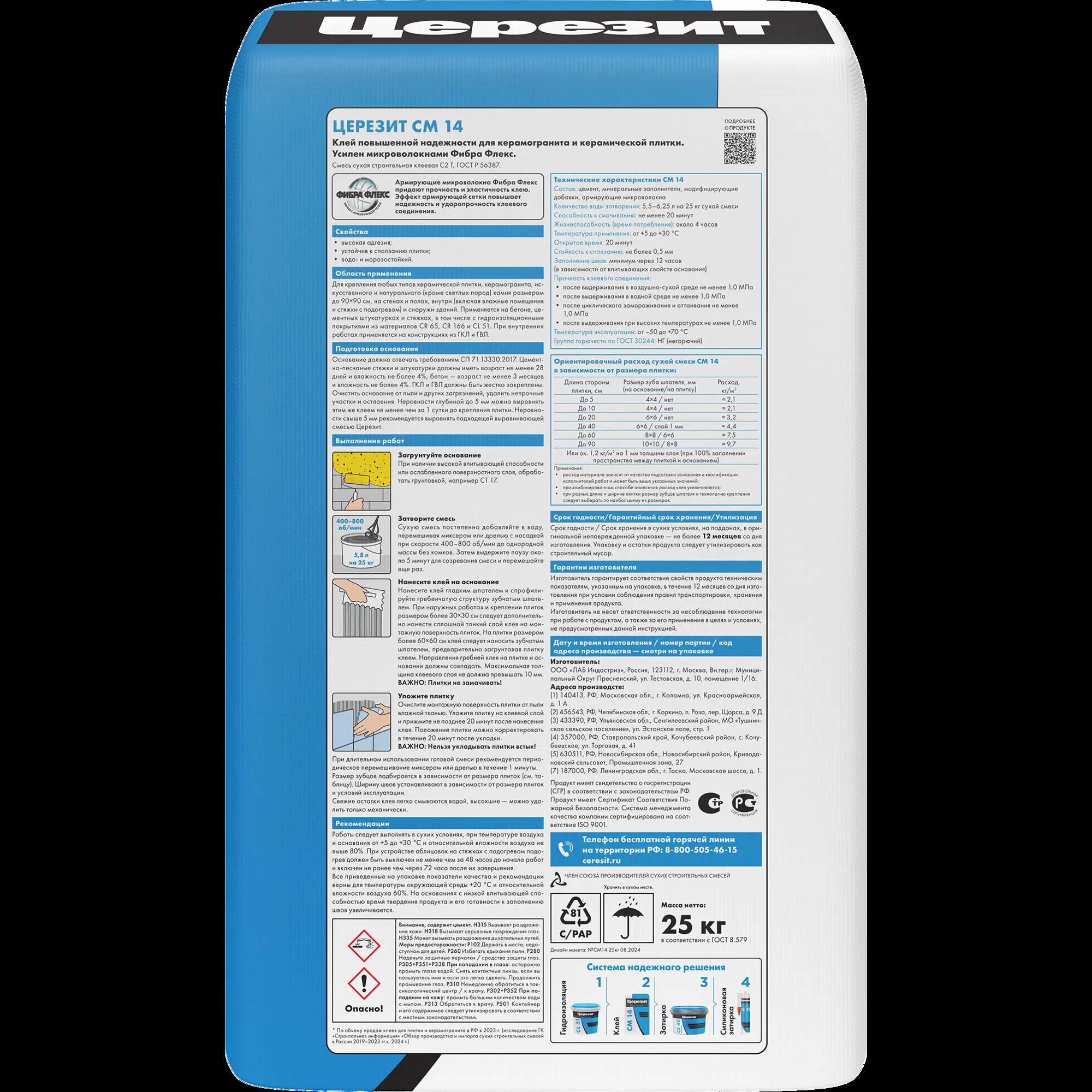 Клей Ceresit CM 14 в мешках по 25 кг Клей для плитки Ceresit CM 14 – цементный клей с улучшенной адгезией на основе серого цемента, который относится к классу C2 T (C2 - цементный с улучшенными характеристиками и высокой адгезией; T – тиксотропный или стойкий к оползанию). Усилен армирующими волокнами Fibre Force, которые добавляют клею прочности и эластичности. Предназначен для выполнения плиточных работ как внутри помещений, так и для уличной облицовки, особенно оправдывая свои характеристики при работах с плиткой формата до 90х90 см при нанесении на вертикальные поверхности. Также допускается для работ с горизонтальными поверхностями, которые будут подвергаться бытовым нагрузкам. Допускается укладки плитки на стяжках с подогревом. Это тонкослойный клей - слой нанесения не должен превышать 10 мм. Подходит для большинства плиточных облицовок от мелкого до формата 90х90 см, за исключением натурального мрамора. Работает по следующим типам оснований: Бетонные и цементные основания; По слою обмазочной гидроизоляции на цементной или акриловой основе (Ceresit CR 65; Ceresit CR 166; Ceresit CL 51) или аналогов. Когда Вам нужно купить клей для плитки Ceresit CM 14? Данный продукт относительно недорогой, и может активно применяется при ремонте квартир и частных домов. Характеристик плиточного клея достаточно для того, чтобы выдержать все бытовые нагрузки и успешно приклеить керамическую плитку или керамогранит типовых форматов. Отлично подойдет для производства ремонта в ванных комнатах и кухнях. Оправдает себя при облицовке цоколя дома плиткой некрупного формата. Тиксотропность данного плиточного клея позволит Вам без проблем работать на вертикальных поверхностях, используя способ укладки сверху вниз без риска оползания облицовочного материала под своим весом. Расход плиточного клея Церезит СМ 14. Расход указывается ориентировочно, поскольку зависит от того, какой слой Вы будете выдерживать при производстве работ. Основные характеристики Бренд Ceresit Цвет товара-серый Вес-25 кг Толщина слоя-10 мм Количество компонентов-1 Форма выпуска-Сухая смесь Жизнеспособность раствора-2 ч Тип работ Внутренние, Наружные Тип основания-бетон Прочие характеристики Максимальная температура применения 70 °C Особенности Вес-25 кг Клей наносят на основание гладким шпателем и профилируют гребенчатую структуру зубчатым шпателем. Размер зубцов выбирают в зависимости от размера плиток (см. таблицу). При наружных работах и креплении плиток размером 30×30 см и более следует рекомендуется дополнительно нанести тонкий сплошной слой клея на монтажную поверхность плиток («комбинированный способ крепления»). При креплении плит сверхкрупного размера (более 60х60 см) дополнительный слой клея на монтажную поверхность плит следует наносить при помощи зубчатого шпателя с тем же размером зубцов или на размер меньше, предварительно загрунтовав плиту сплошным слоем клея, с усилием втирая его в поверхность. При укладке плит направления гребней клея на плите и основании должны совпадать, а прижатие плит к основанию должно быть максимально плотным. Плитки не замачивать! Плитку укладывают на клей и прижимают не позднее 20 минут после его нанесения. Положение плитки можно корректировать в течение 20 минут после укладки. Площадь адгезионного контакта после прижатия плитки должна быть не менее 65% на стенах и 80% на по