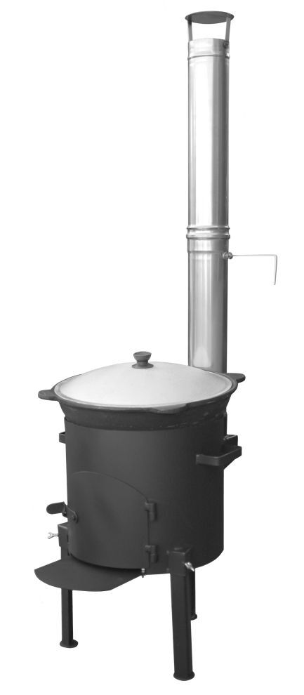 Печь под казан с дымоходом предназначена для приготовления пищи на открытом воздухе. Печь изготовлена из листовой стали Ст3СП5 толщиной 2мм и окрашена термостойкой краской Certa черного цвета, требующей предварительного обжига для её полимеризации (отвердевания). Печь под казан комплектуется тремя съемными ножками, удлинителем топочной части, дверкой и комплектом дымоходов из нержавеющей стали с шибером и зонтом.