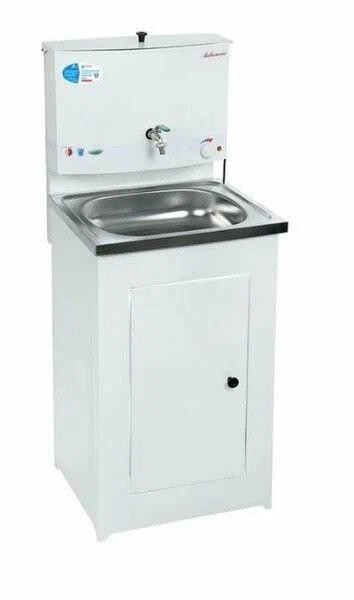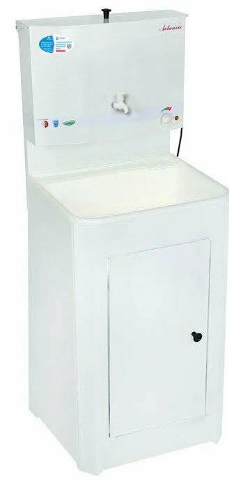 Умывальник акватекс, с ЭВН, мойка нерж. сталь. Бак имеет пробку для слива воды. Плавная регулировка нагрева до 60 градусов. Размер умывальника в сборе: ширина – 50 см, глубина - 43 см. Нержавеющая раковина 50 х 40 см. Тумба поставляется в разобранном виде в коробке размером 80 х 54 х 20 см, вес 12 кг. Дачный умывальник просто незаменим для усадьбы, гаража, дачи, мастерской и других мест, где нет центрального водопровода и канализации. Стильный вид и современный дизайн позволит дачному умывальнику Акватекс прекрасно вписаться в любой интерьер. Умывальник дачный выполнен из высококачественной стали 0,7 мм, окрашен крепкой краской различных цветов: серебро, белый, медь, белое золото, лагуна. Конструкция умывальника Акватекс составная: включает в себя тумбу, которая аккуратно скрывает способ слива воды и позволяет осуществлять водоотвод в канализацию или отдельную емкость, и бак с металлическим шаровым краном. Емкость бака внутри обработана гальваническим цинковым покрытием, которое обеспечивает долгий срок службы изделия и исключает появление ржавчины (если не будет мех. повреждений). Объем бака 17 л. Умывальники оборудуются как пластиковыми мойками, так и нержавеющими. Время нагрева бака 17 литров до температуры 60 градусов составляет около 30 минут. ТЭН бака мощностью 1,25 кВт поддерживает температуру воды и регулирует подогрев. Вес изделия 12 кг, упаковано в прочную коробку евростандарта с ручками, что обеспечивает удобство в погрузке и транспортировке. Преимущества умывальника «Акватекс» перед похожими моделями других производителей: Гальваническое цинковое покрытие бака (новая технология); Усиленная стойка бака; Продукция сертифицирована; Увеличенная высота тумбы; Металлический шаровый кран; Плавная регулировка температуры воды; Коробка евростандарта с ручками (удобство транспортировки); Отсутствие петель (источник появления коррозии); Тумба на ножках (циркуляция воздуха под тумбой сохраняет ЛКП от преждевременной коррозии).