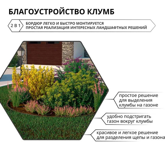 Бордюр садовый Gidrolica предназначен для обрамления газона, создания клумб, разграничения грядок и обрамления дорожек. Бордюр прост в монтаже и не требует подготовки траншей и фундамента. Обладает гибкостью при монтаже, подходит как для радиусной выкладки, так и для прямой. Садовый бордюр используется совместно с крепящим якорем, количество которого зависит от выкладки. Вы можете приобрести якорь отдельно в необходимом количестве, код товара 16195927.