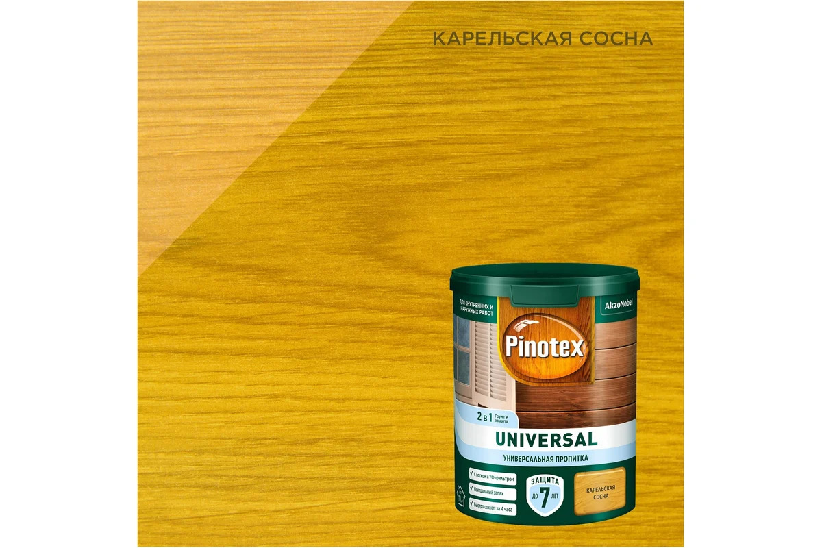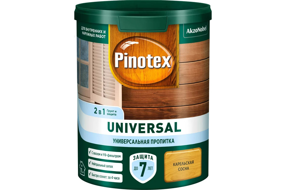 Пропитка 2 в 1 Pinotex UNIVERSAL карельская сосна, 0,9 л 5620703 - универсальная пропитка на водной основе для защиты древесины на срок до 7 лет*. Для обработки древесины снаружи и внутри помещений. Формула 2 в 1. Наносится без грунта, питает и защищает от влаги, загрязнений и атмосферного воздействия. Усилена УФ-фильтром для защиты от выгорания. С воском для дополнительной влагостойкости. Паропроницаемое «дышащее» покрытие – не задерживает влагу внутри древесины. Запах нейтральный, легко наносится и быстро сохнет. Низкое содержание ЛОС (Летучие Органические Соединения). Сохраняет видимой текстуру древесины, полуматовая. Для дополнительной защиты от плесени и грибка при наружных работах используйте грунт Pinotex Base. Область применения. Для наружных работ: деревянные фасады, беседки из бруса, вагонки, планкена, а также окна, двери, скамейки и столешницы. Для внутренних работ: потолки, стены из бруса, бревен, вагонки, мебель. Допускается окрашивание деревянного пола с последующим нанесением яхтного лака Pinotex Lacker Yacht. Особенности применения. Обрабатываемая поверхность должна быть сухой (влажность менее 18%), чистой. Работы рекомендуется проводить в безветренную погоду при температуре воздуха не ниже +10°C и не выше +30°C с относительной влажностью воздуха не более 80%. Деформация древесины в процессе усадки или несоблюдение условий нанесения может привести к нарушению целостности покрытия, в этом случае проведите ремонтные работы по его восстановлению.