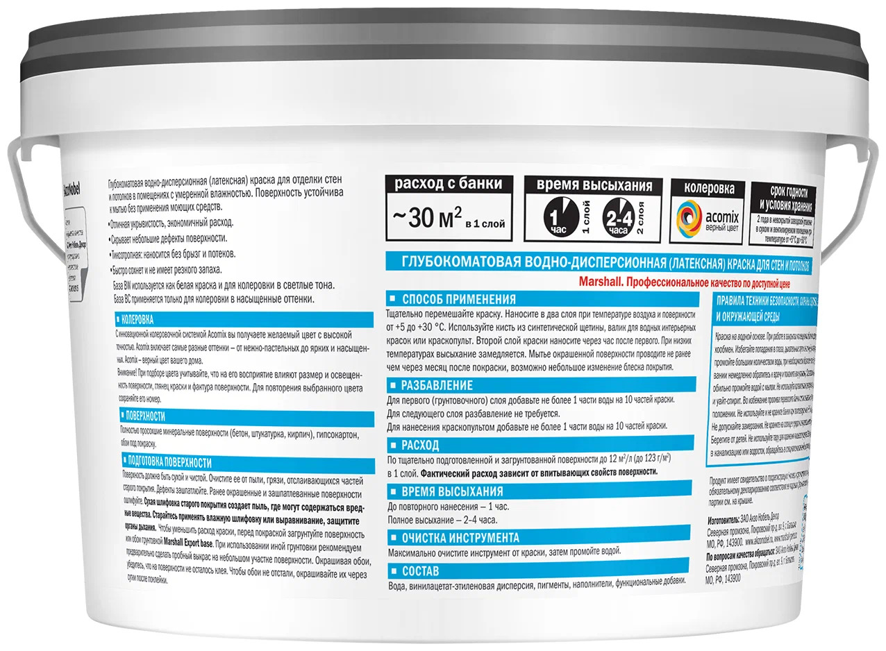 Глубокоматовая водно-дисперсионная (латексная) краска для стен и потолков. Обладает высокой адгезией, продлевая срок службы окрашенной поверхности. Скрывает небольшие дефекты поверхности. Продукт удобен в применении. Отличается высокой укрывистостью, что позволяет сократить расход лакокрасочного материала. Краска быстро высыхает. Не имеет резкого запаха. Для внутренних работ. Подходит для нанесения на полностью просохшие гладкие минеральные поверхности (бетон, штукатурка, кирпич и т. п.), гипсокартон, обои под покраску. Рекомендуется для окрашивания помещений с умеренной влажностью, таких как спальня, гостиная, кабинет, кладовка, гардеробная и т. п. Сертифицирована для применения в детских и лечебно-профилактических учреждениях. Перед применением тщательно перемешать. Произвести подготовку поверхности. Рекомендуется наносить в два слоя при температуре от +5°C до +30°С, относительной влажности воздуха от 40 до 80%. Для укрепления базовой поверхности, повышения адгезии и уменьшения расхода краски загрунтуйте подготовленную поверхность грунтовкой Marshall Export Base. Для первого (грунтовочного) слоя по новой или очищенной поверхности разбавить в соотношении не более 1 части воды на 10 частей краски. Для следующего слоя разбавление не требуется.