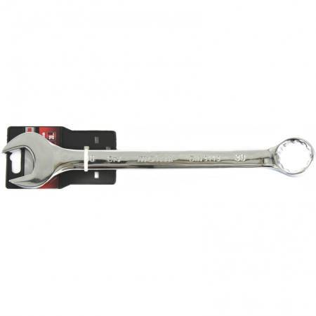 Ключ гаечный комбинированный с открытым и кольцевым зевом предназначен для монтажа (демонтажа) резьбовых соединений. Ключ изготовлен из хромованадиевой стали. Твердость материала рабочей части ключа 45 HRC (требования ГОСТ – 45–51 HRC). Ключ имеет антикоррозионное покрытие из хрома. Профиль кольцевого зева имеет 12 граней, что увеличивает площадь соприкосновения рабочих поверхностей и снижает риск деформации граней крепежа при монтаже. Угол наклона кольцевого зева относительно плоскости ключа в 15 градусов делает монтаж более удобным.