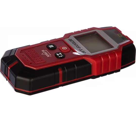 Детектор с питанием от элемента 6LR61 (9 В) предназначен для обнаружения металлов (сталей и цветных металлов), арматуры, различных проводников и проводов под напряжением, а также деревянных конструкций в стенах и перекрытиях глубиной до 80 мм и точностью ±1 см.