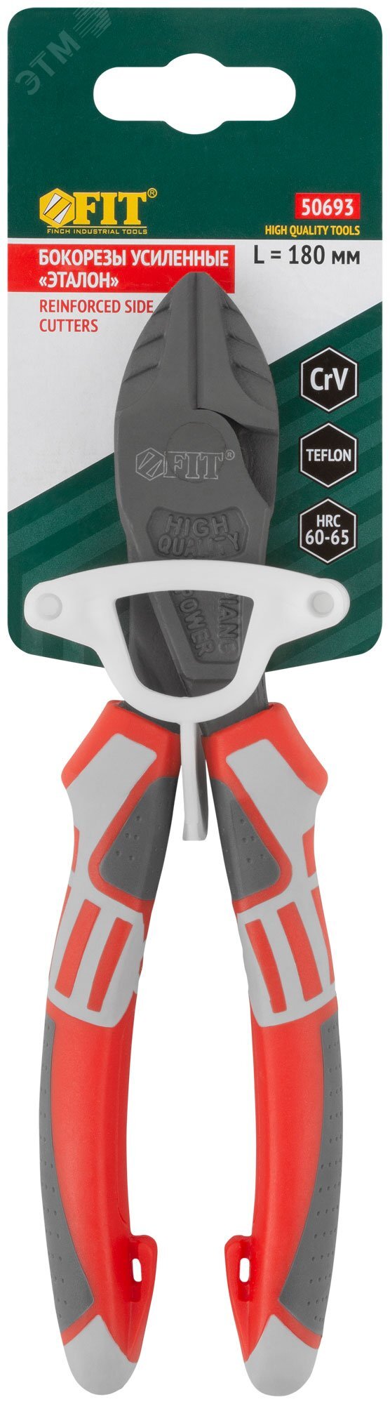 Усиленные бокорезы ''Эталон'' FIT HQ предназначены для профессионального применения. Их конструкция позволяет развивать большее усилие при сведении губок по сравнению с обычными бокорезами. Инструмент изготовлен из закаленной хром-ванадиевой стали, обеспечивающей высокий ресурс и износостойкость. Смещенный к режущим кромкам шарнир увеличивает усилие реза на 50 %. Индукционная закалка режущих кромок до твердости HRC 60–65 дает возможность резки твердой проволоки или кабеля. Дополнительные ребра жесткости на губках повышают прочность конструкции. Тефлоновое покрытие предотвращает коррозию. Эргономичные трехкомпонентные пластиковые прорезиненные рукоятки обеспечивают надежный хват.