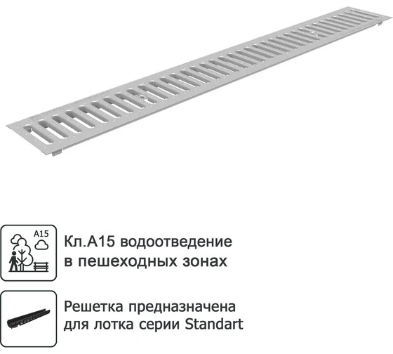 Решетка водоприемная Gidrolica Standart, 1000х136х22 мм, стальная оцинкованная класса А15 предназначена для защиты лотка водоотводного от попадания листвы и мусора. Данные решетки предназначены для покрытия лотков пластиковых водоотводных Gidrolica Standart DN100. При установке решетки на лоток серии Gidrolica Standart потребуется два крепежа. Решетка устанавливается в зоне пешеходной нагрузки, согласно ее несущей способности.