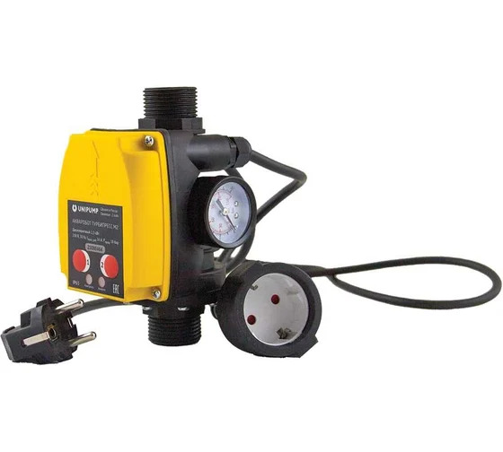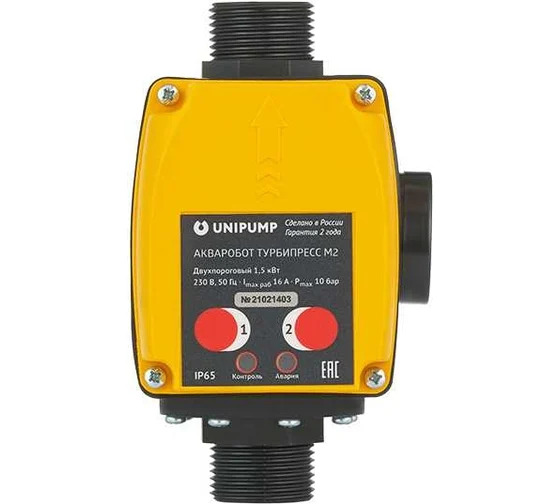 Блок выпускается с подключенными кабелями со штепсельной вилкой и розеткой. Блок автоматического управления насосом АКВАРОБОТ ТУРБИПРЕСС М2 предназначен для автоматического управления однофазными насосами мощностью до 1,5 кВт по потоку жидкости и по давлению в системе. Функциональные возможности: пользовательская настройка давления включения Pмин и давления выключения Pмакс насоса; автоматически включает насос при снижении давления в системе ниже Pмин; автоматически выключает насос при достижении в системе давления Pмакс; автоматически выключает насос, если он не может создать давление верхнего порога при отсутствии потока жидкости; защищает насос от работы в режиме «сухого хода» и осуществляет серию пробных пусков для выхода из режима аварии; защищает систему водоснабжения от возникновения давления более 10 бар в режиме настройки порогов давления; стабильно работает при пониженном напряжении в электрической сети до 170 В.