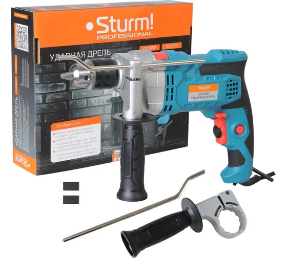 дрель, дополнительная рукоятка, ограничитель глубины сверления, дополнительные угольные щётки (2 шт.), ключ, инструкция по эксплуатации, гарантийный талон.