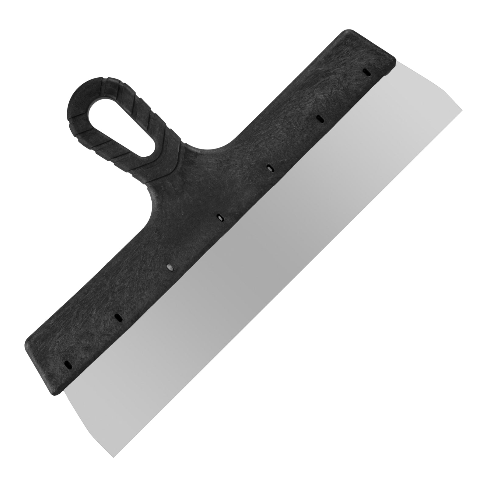Фасадный шпатель из нержавеющей стали с пластиковой рукояткой предназначен для нанесения и разравнивания толстого шпаклевочного слоя и штукатурных смесей на большие поверхности.