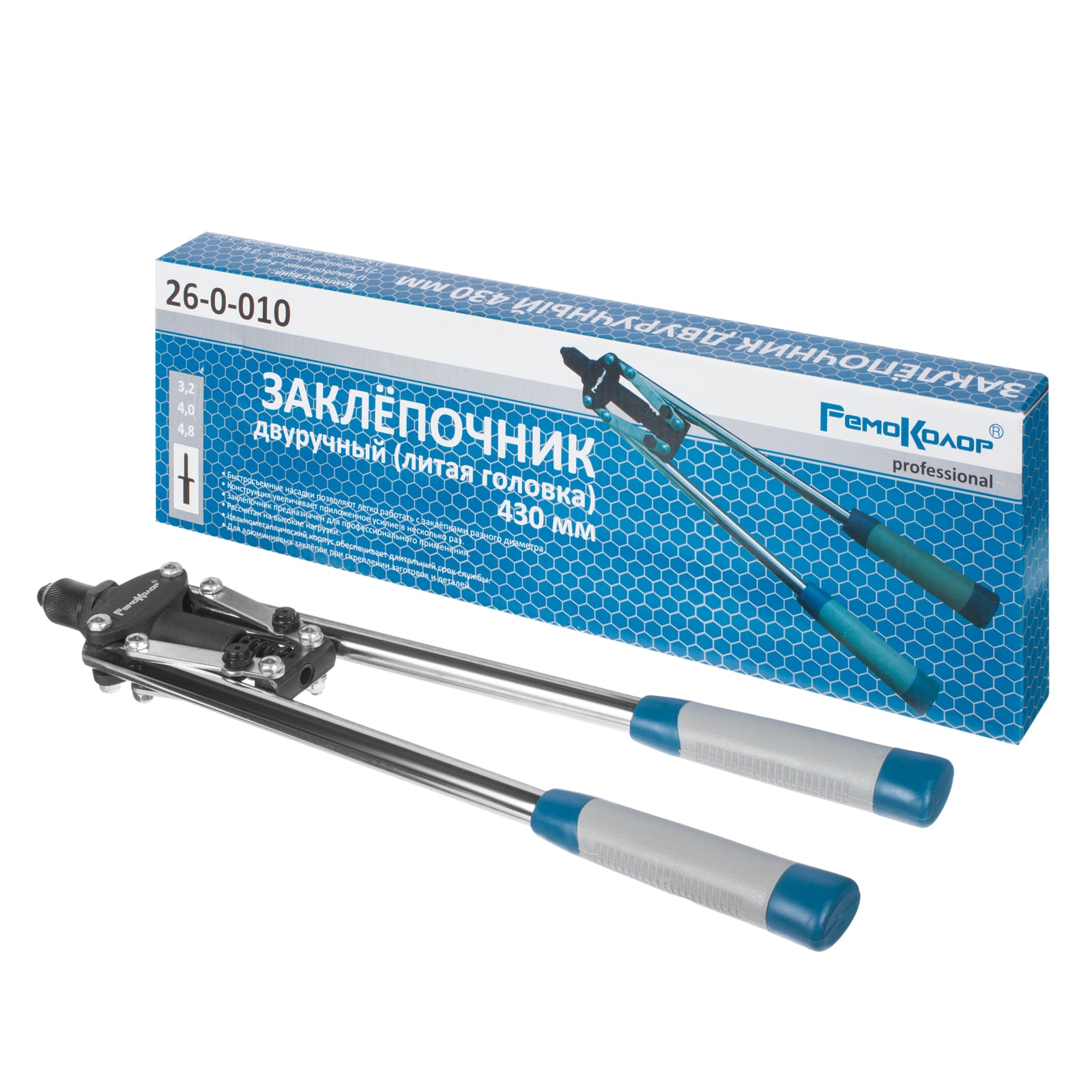Заклёпочник двуручный РемоКолор 26-0-010 применяется для соединения тонкостенных металлических листов между собой. Сконструированный механизм устойчив к нагрузкам. Рабочие части выполнены из качественного материала, который гарантирует долгую и надежную службу. Удлиненные рукоятки имеют эргономичную форму, благодаря чему они комфортно располагаются в руках и обеспечивают качественную работу с инструментом.