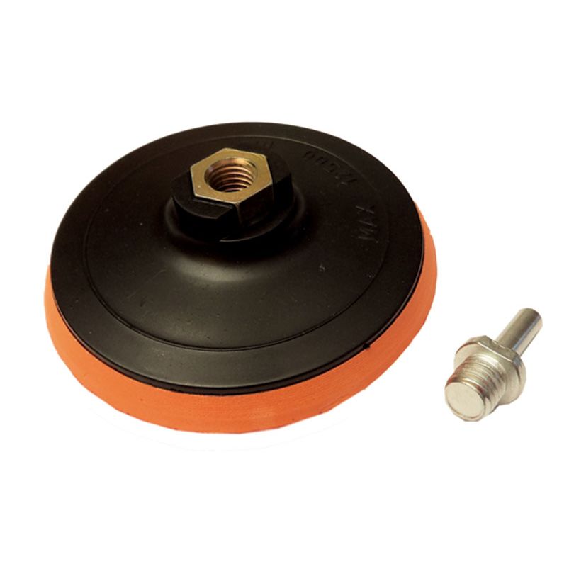 Тарелка опорная для дрели и УШМ, 115 мм, гайка М14, крепление VELCRO. Применяется как съемная насадка-переходник для шлифовальных, полировальных машин и дрелей. Служит основанием для закрепления абразивных шлифовальных кругов диаметром 115 мм с помощью липучки. Комплектуется переходником для дрели с гайкой М14 на хвостовике. Материал: пластик, резина, сталь.