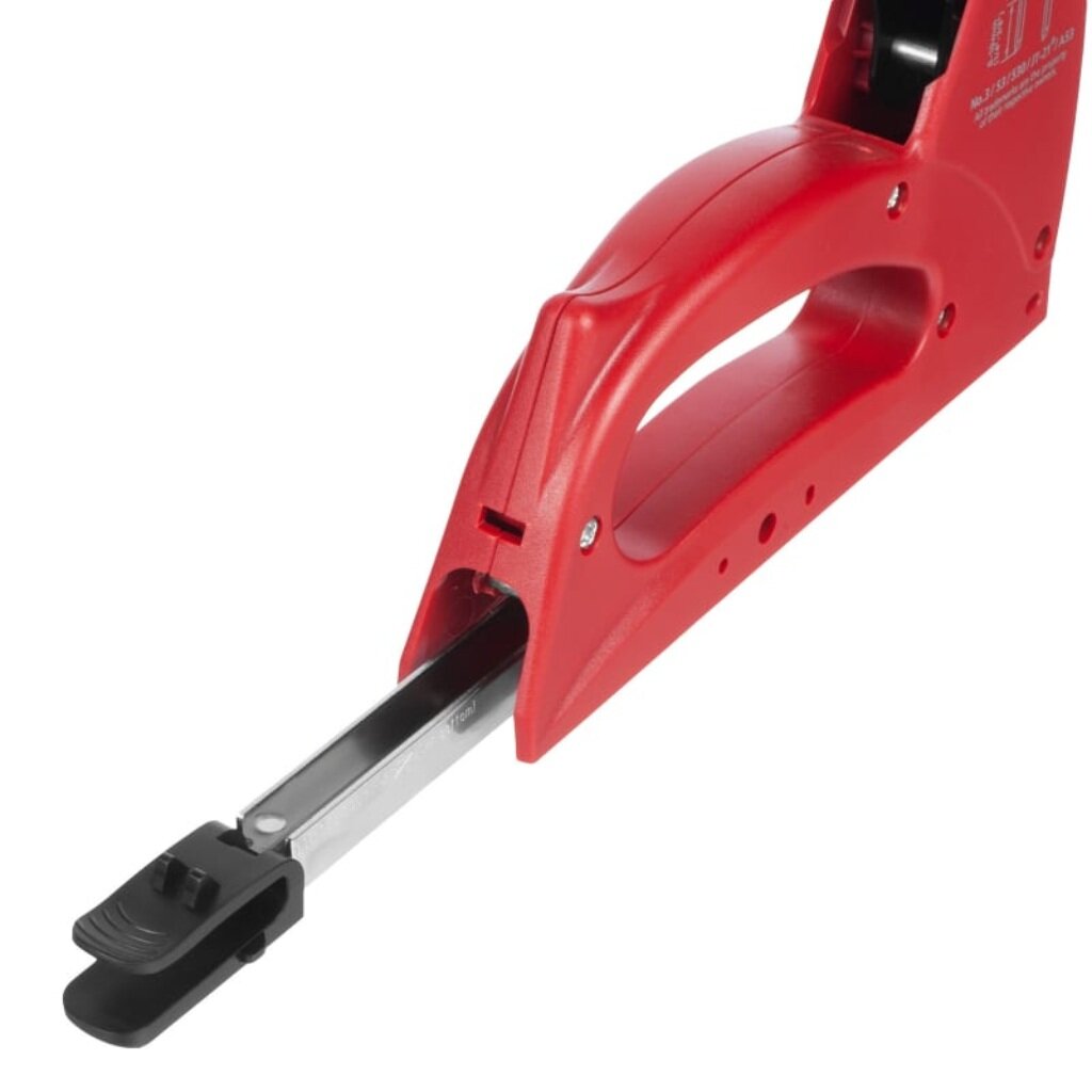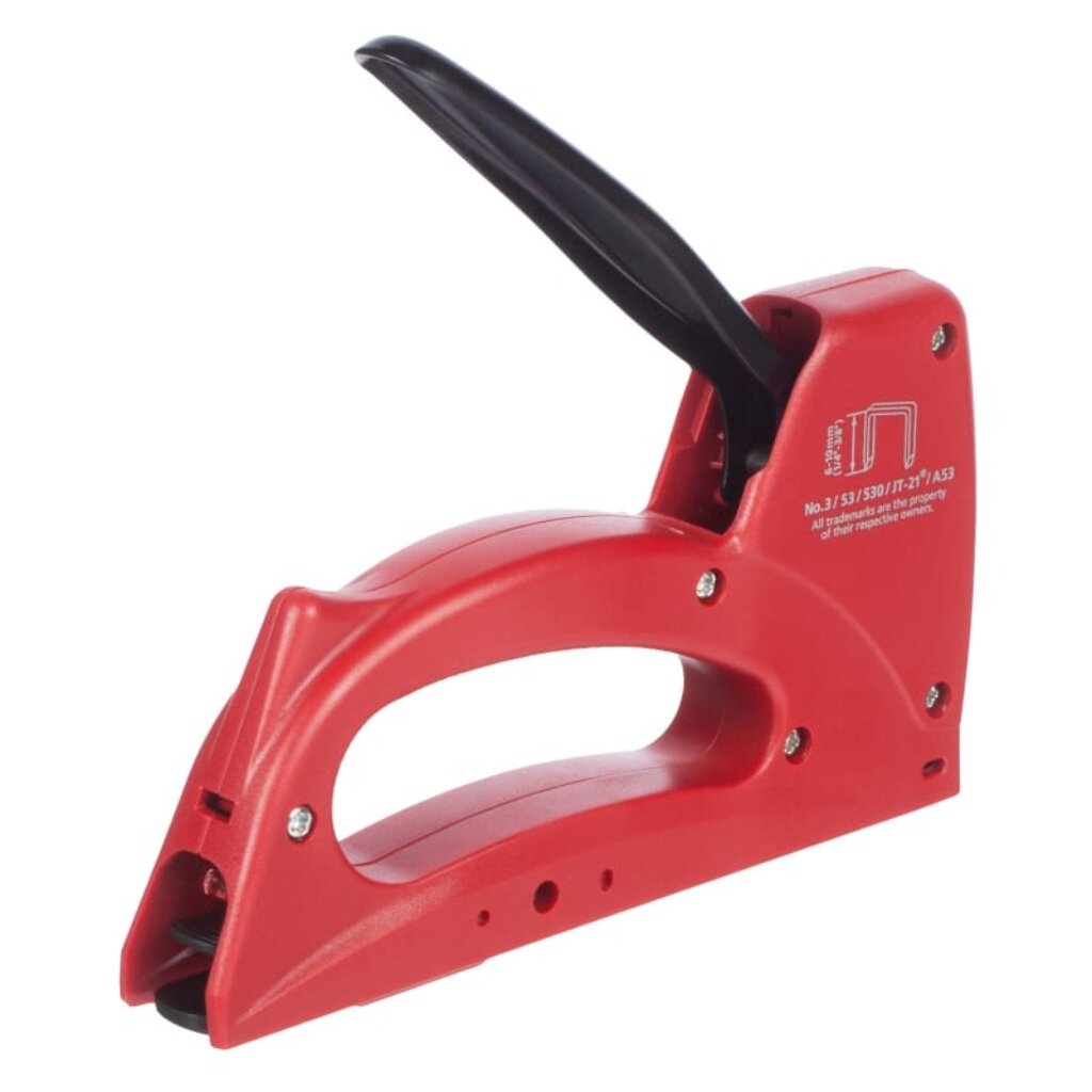 Строительный степлер — инструмент для крепления скобами различных материалов к деревянному основанию. В отличие от офисного степлера скоба строительного степлера не пробивает материал насквозь, и её концы не загибаются. Облегчённый ударопрочный корпус из ABS-пластика с металлической ручкой.Компактные размеры и отсутствие съёмных частей.Оснащён рессорным механизмом.Ручка степлера имеет предохранитель для удобства и безопасности пользователя.Удобные механизмы для быстрой замены скоб и лёгкого нажатия на рукоятку при забивании скобы.В корпусе есть окошко-индикатор для контроля остатка скоб.