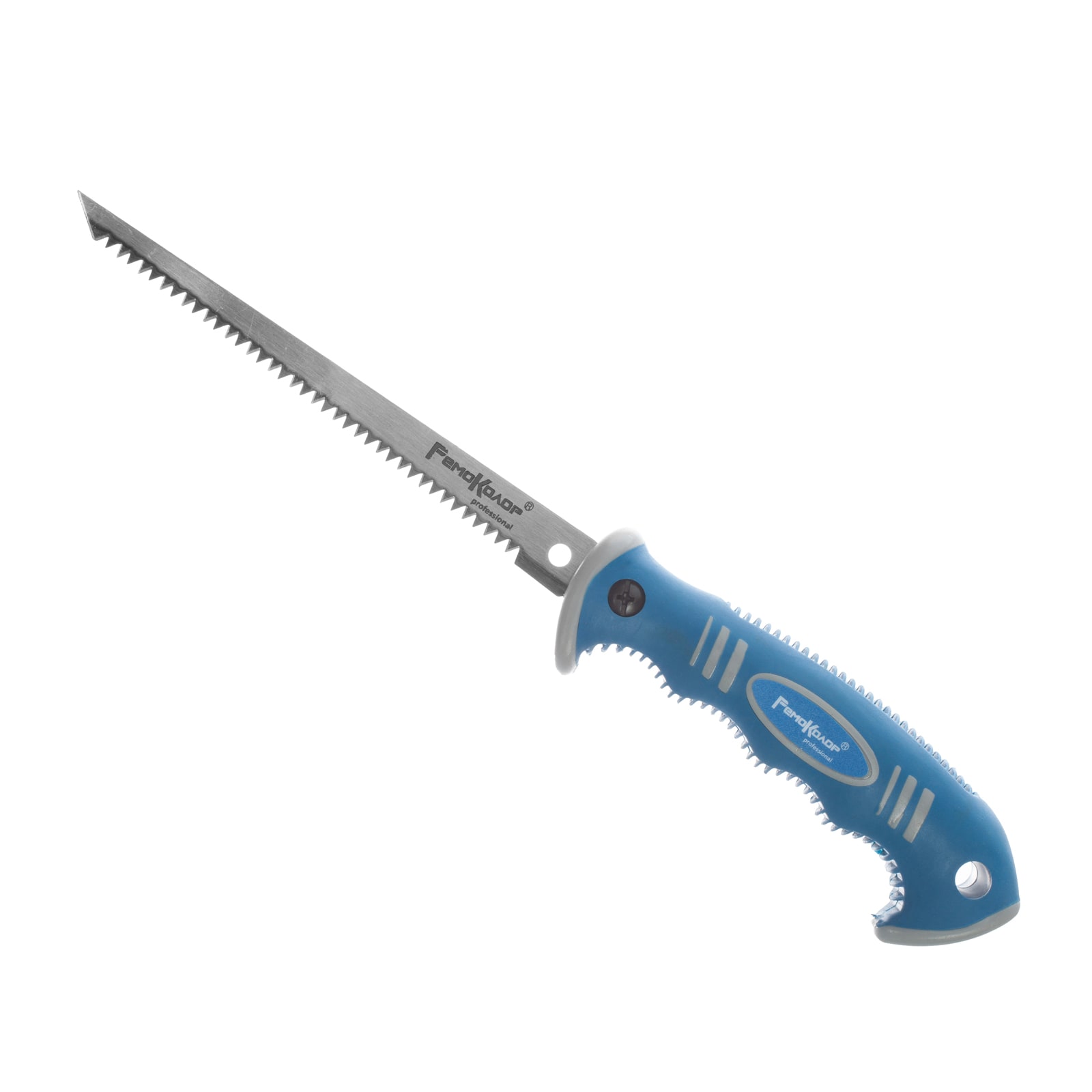 Предназначена для распила заготовок из гипсокартона, дерева и пластмассы. Зубья с трехгранной заточкой, шагом 7 TPI / 3,5мм и закалкой 55HRC. Толщина полотна 1.4 мм, длина 150 мм. Полотно – углеродистая сталь 65MN, двухкомпонентная рукоятка из ABS-пластика со вставками из термопластичной резины.