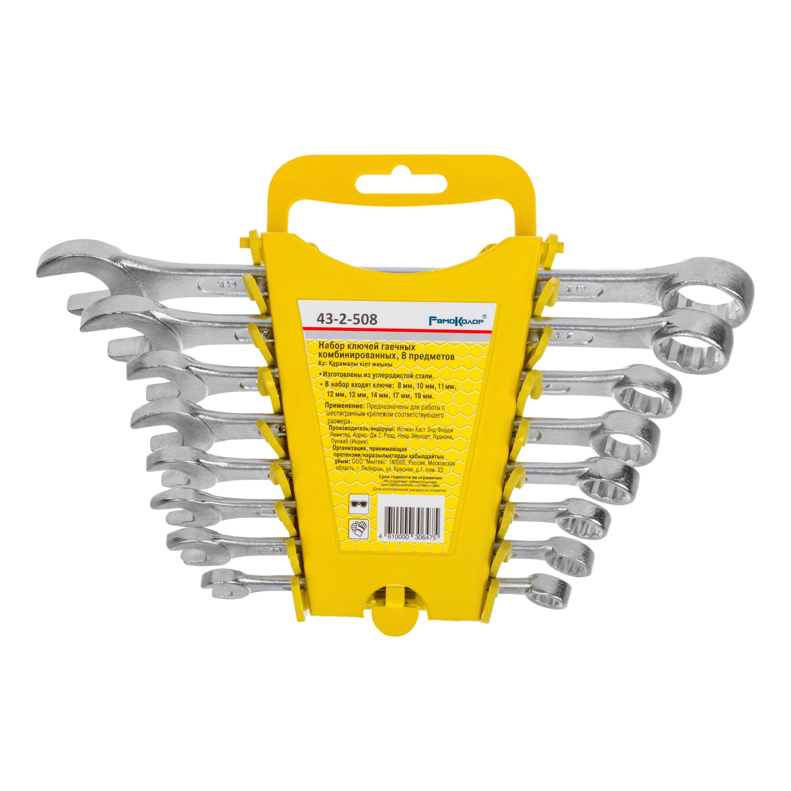 Набор гаечных комбинированных ключей РемоКолор, углеродистая сталь, 8 предметов 43-2-508 очень удобен для использования с крепежом, обладающим внешней шестигранной головкой. Он изготовлен из инструментальной углеродистой стали, которая прослужит долгое время. Благодаря хромированному покрытию исключено образование коррозии.