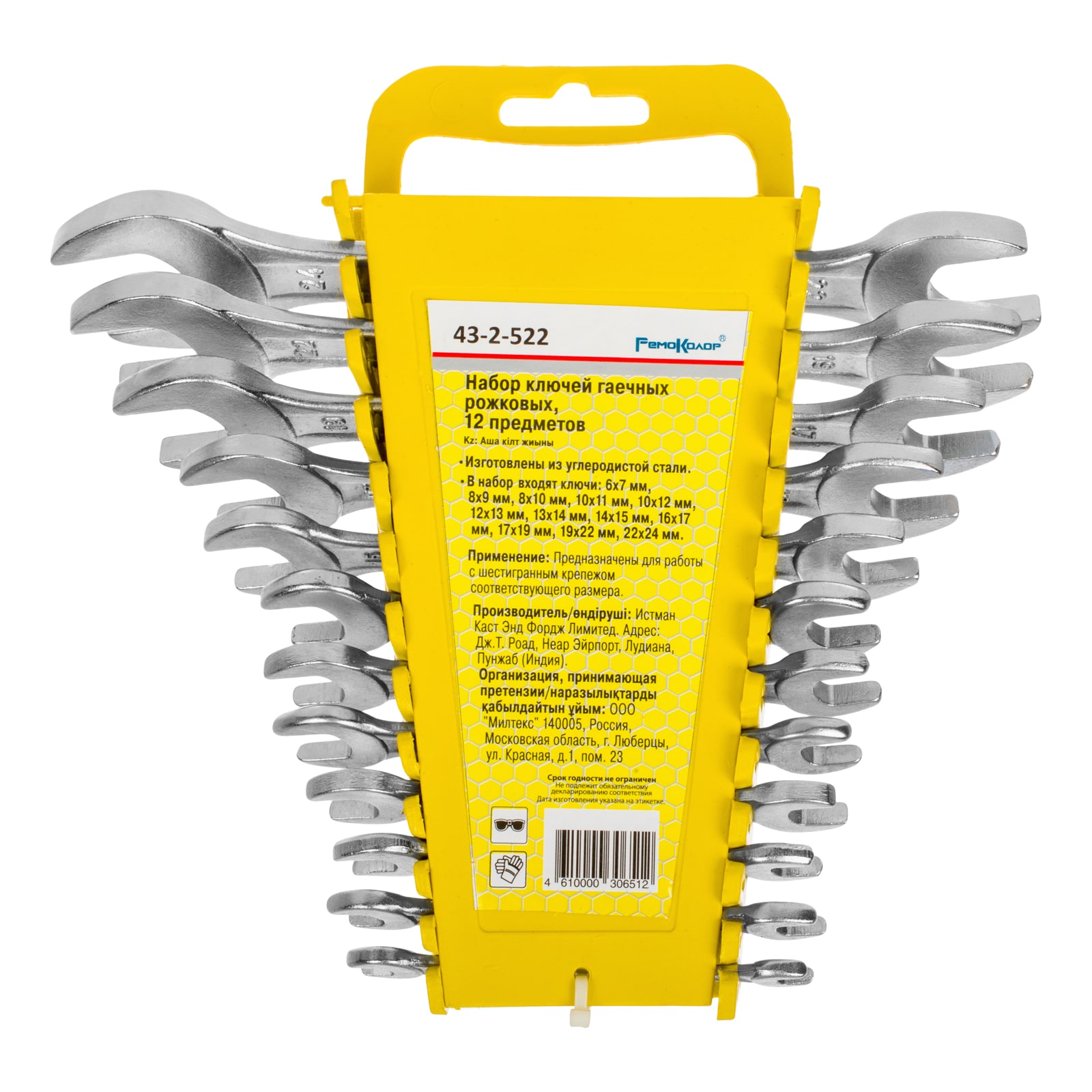 Набор гаечных рожковых ключей РемоКолор, углеродистая сталь, 12 предметов 43-2-522 предназначен для обслуживания резьбовых элементов с шестигранными головками различных размеров. Комплект изготовлен из инструментальной углеродистой стали, обеспечивает долгую службу.