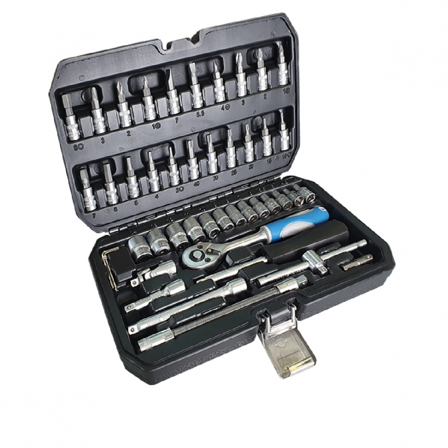 Набор автомобильного инструмента РемоКолор 46 предметов 43-4-146 предназначен для обслуживания автомобиля профессионалами и автолюбителями. Изделия в наборе изготовлены из высококачественной хромованадиевой стали, упругой и износостойкой. Кейс для инструментов выполнен из экологичного пластика.