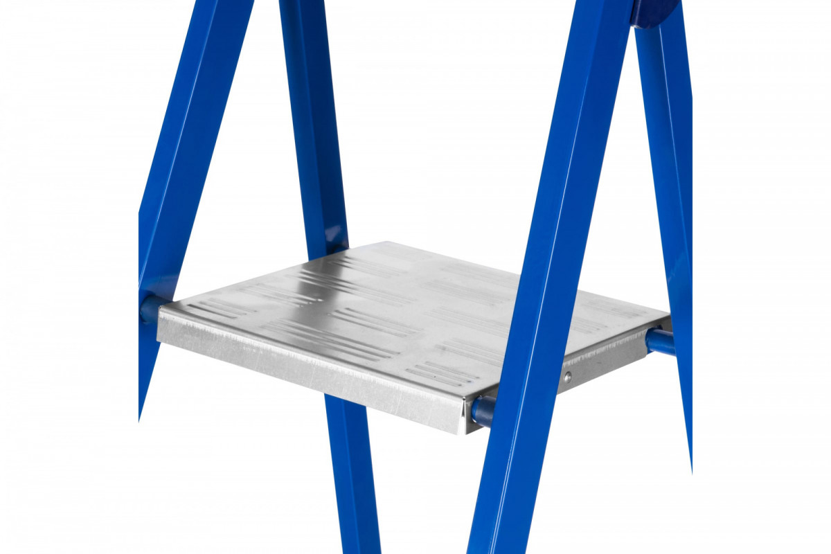 Ступени выполнены из алюминия, имеют специальное рифление, что снижает вероятность скольжения во время работы. Прочный страховочный ремень предотвращает выход стремянки из рабочего положения, что обеспечивает безопасную работу на верхних ступенях. Применяется в быту и строительной области.