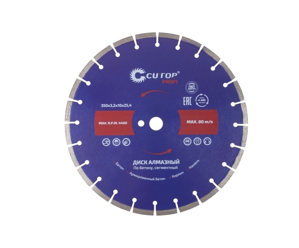 Диск отрезной алмазный сегментный по бетону Profi 350x3.2x10x25.4 мм CUTOP 73-419 предназначен для сухой и мокрой резки бетона, железобетона, плитки, кирпича, камня и других высокоабразивных и среднеабразивных материалов. Способен резать железобетонные конструкции, кирпич, известняк и другие твердые материалы. Используется в швонарезчиках и бензорезах.