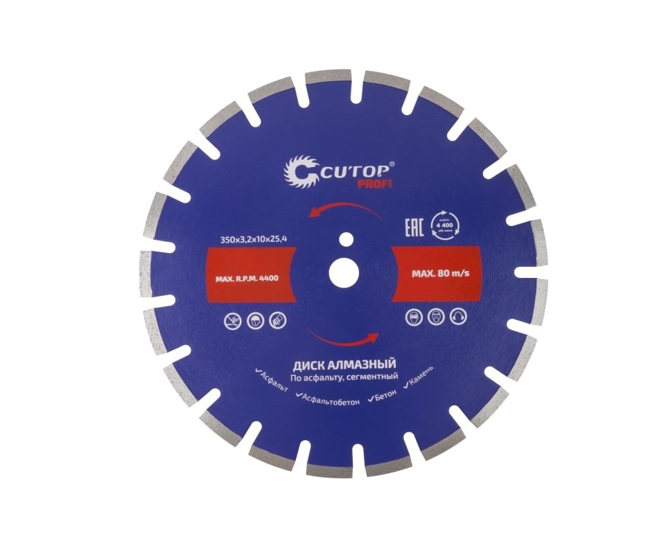 Диск отрезной алмазный сегментный по асфальту Profi 350x3.2x10x25.4 мм CUTOP 73-420 предназначен для сухой и мокрой резки асфальта, асфальтобетона и других высокоабразивных материалов. Используется в швонарезчиках и бензорезах. Благодаря широкому алмазному слою, обеспечивается быстрое резание и долгий срок службы. Режущая кромка высотой 10 мм состоит из сегментов, изготовленных с применением высококачественных технических алмазов повышенной прочности, приваренных методом пайки к телу диска. Диск отлично сбалансирован, это позволяет производить точные работы и продлить срок службы инструмента. Имеет дополнительное крепежное отверстие на корпусе, которое используется для лучшей фиксации диска и защиты от проскальзывания во время работы.