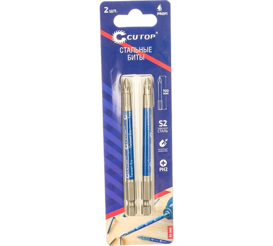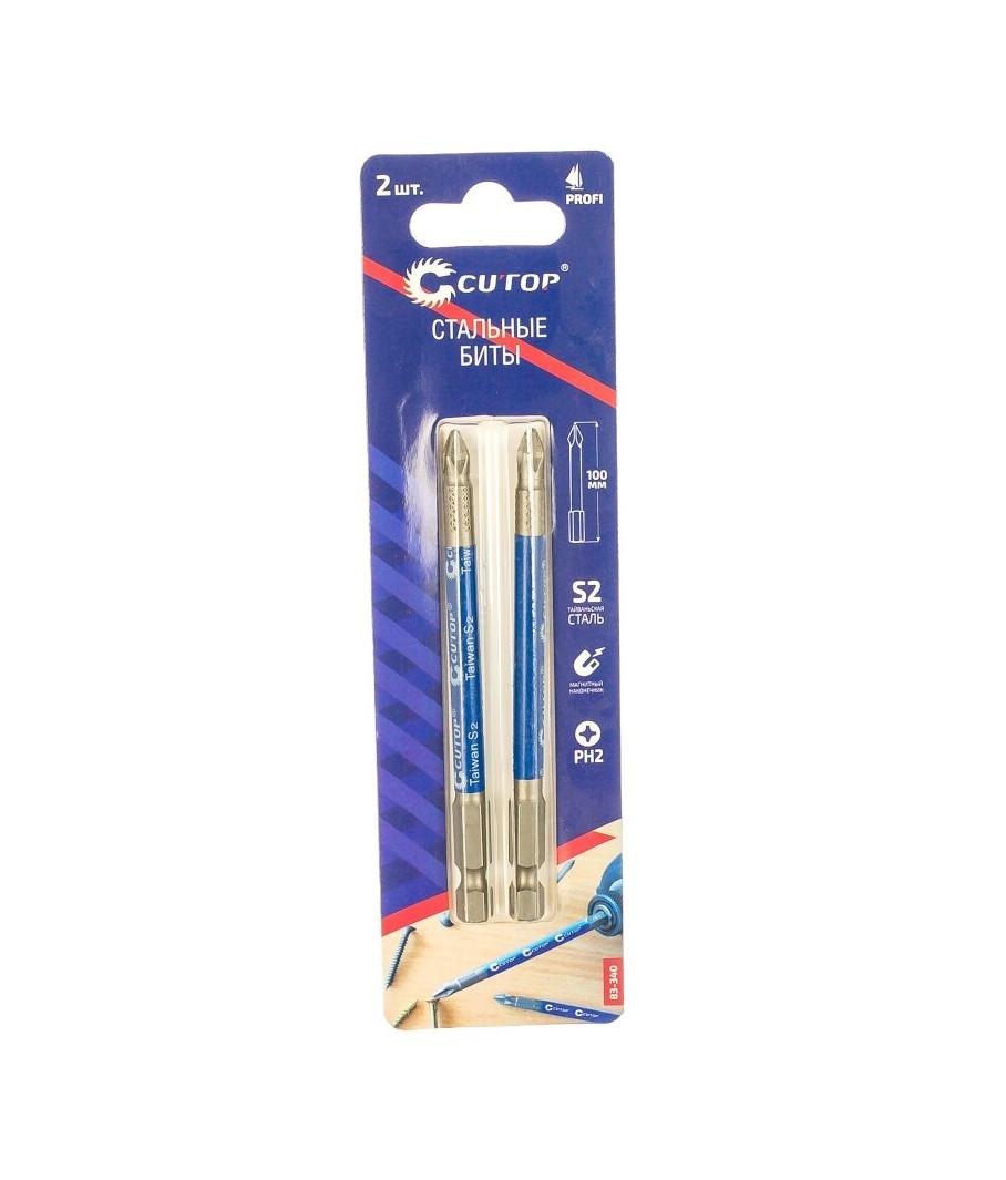Набор стальных бит Profi (2 шт; PH2; 100 мм) CUTOP 83-340 предназначен для шуруповертов и гайковертов. Биты произведены по технологии CUTOP, ресурс от 2000 шт. саморезов. Ребра биты производятся с помощью холодной штамповки, кончик проходит специальный процесс закалки при температурах до 870°C, что увеличивает срок службы и обеспечивает высокую точность.