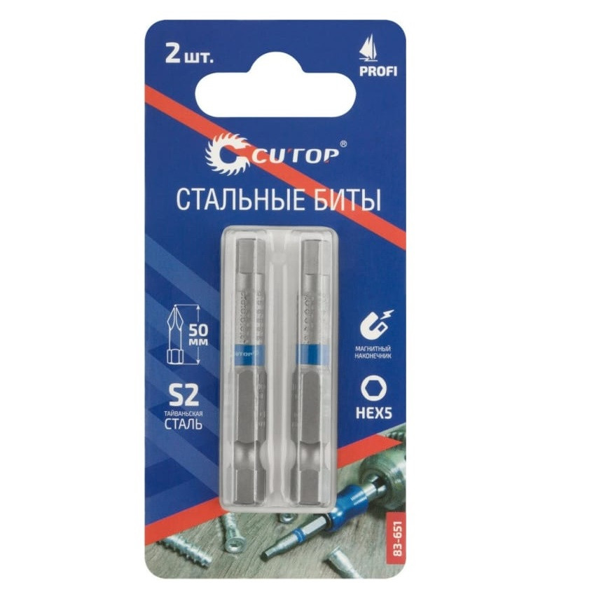 Биты стальные Profi 2 шт, HEX5, 50 мм CUTOP 83-651 предназначены для работы с шуруповертами при монтаже/демонтаже крепежа. Ресурс биты от 2000 шт саморезов.Биты изготавливаются из тайваньской стали высшего качества марки S2. Ребра биты производятся с помощью холодной штамповки в соответствии с точной спецификацией. Кончик проходит специальный процесс закалки при температурах до 870°C. Результатом является насадка с твердостью 60 HRC с высоким сроком службы. Намагниченный шлиц. Высокая точность.