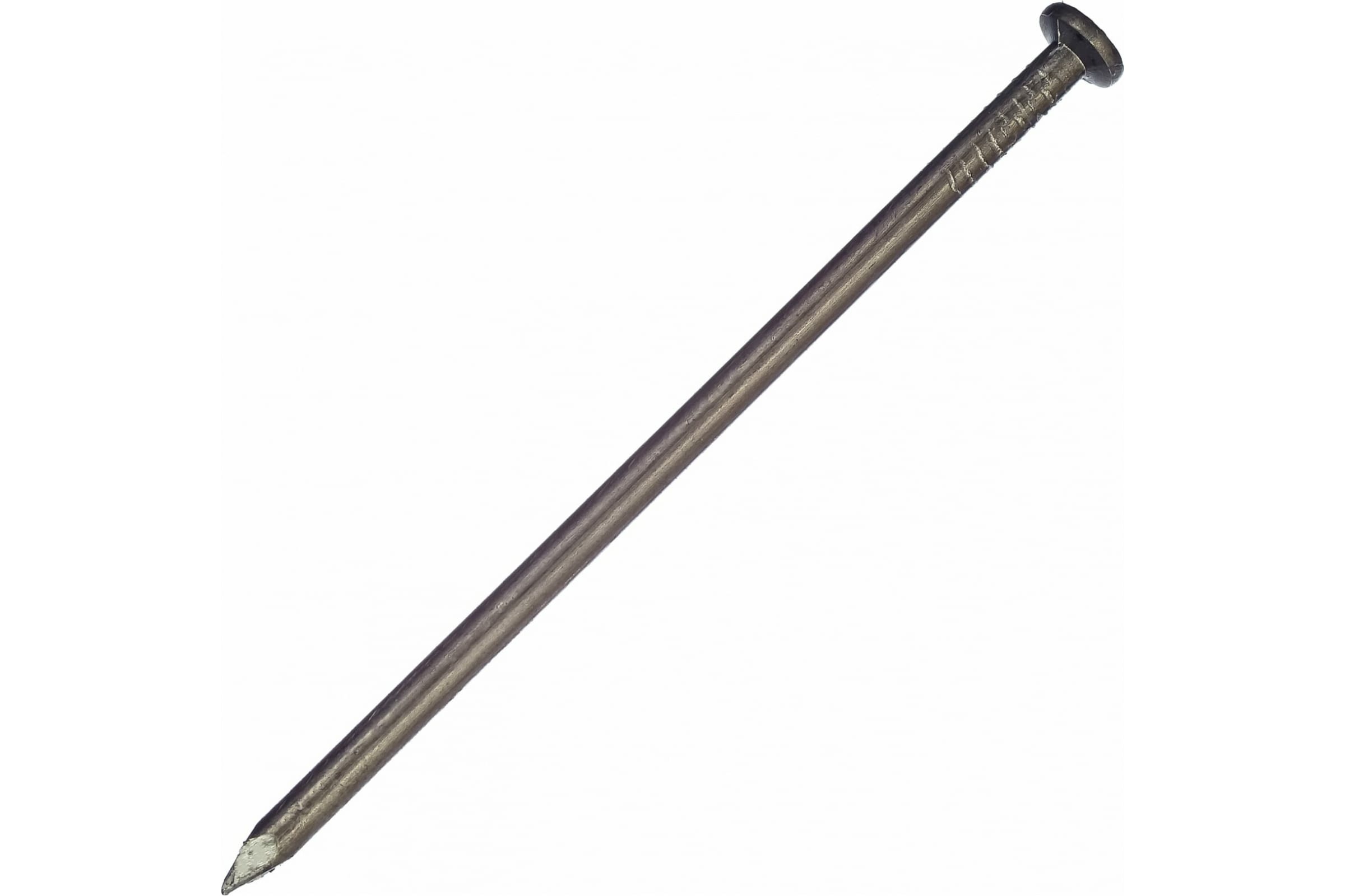 Гвоздь представляет собой длинный и прямой стержень с небольшими неровностями рядом со шляпкой, что улучшает качество соединения.