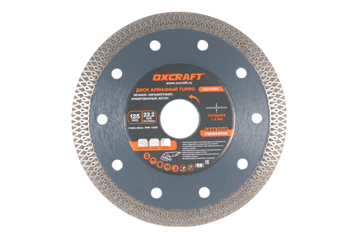 Диск алмазный сплошной Turbo OXCRAFT PO000105820 является сменным элементом для угловой шлифовальной машинки.Диск можно применять для сухой резки керамической плитки и керамогранита.Х-образная режущая кромка позволяет резать без применения воды, не допускает сколов. Обеспечивает высокую производительность.