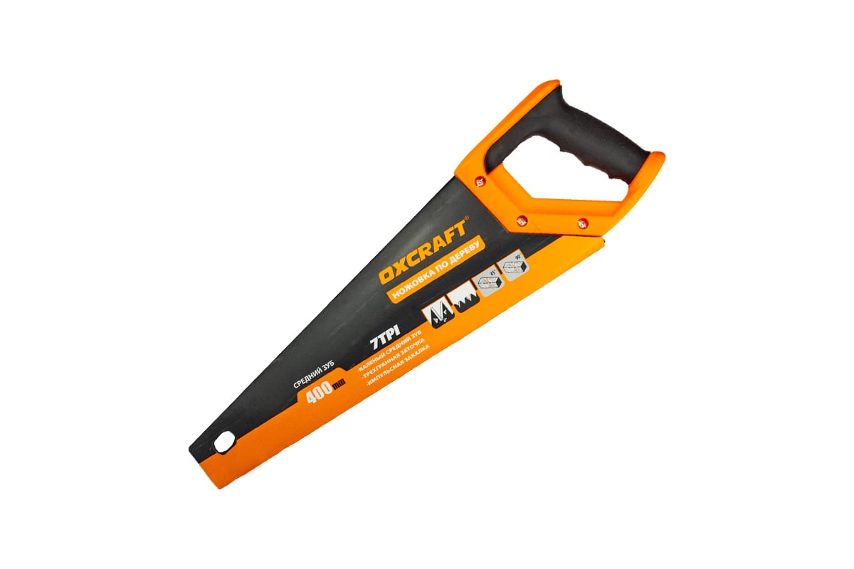 Ножовка по дереву предназначена для распила заготовок из древесины. Полотно выполнено из стали 65 Mn с заточенными под двумя углами зубьями. Зубья закалены и подвержены трехсторонней заточке, что обеспечивает точный и быстрый срез. Пластиковая рукоятка частично обрезинена для надежного хвата и удобства при работе.