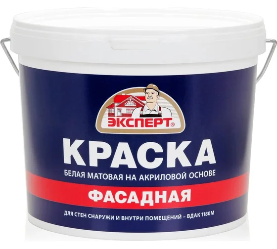 Фасадная краска применяется для окраски фасадов и цоколей зданий, а также стен снаружи и внутри помещений. Благодаря составу, продукт обладает отличными адгезионными свойствами к поверхностям: бетонным, оштукатуренным, кирпичным, асбоцементным, цементным, ДСП и ДВП. Краска равномерно распределяется по основанию при помощи валика, кисти или краскораспылителя, образуя прочное покрытие стойкое к вредным факторам окружающей среды. Состав белого цвета имеет высокую степень укрывистости. Возможность ручной колеровки акриловыми колорантами или пигментами для красок на водной основе, позволяет получить желаемый оттенок. Преимущества: Для наружных и внутренних работ. Высокая адгезия к минеральным поверхностям. Отличная укрывистость. Атмосферостойкая. Возможность ручной колеровки. Простое нанесение (не требует специального оборудования).
