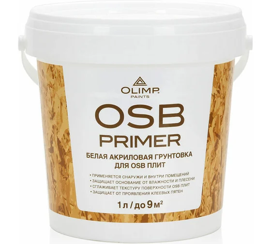 Грунт акриловый для OSB-плит OLIMP - грунтовка для грунтования фасадов, стен и потолков из OSB плит снаружи и внутри помещений. Может использоваться для консервации OSB плит на период строительства. Снижает расход финишного покрытия примерно на 30%. Сглаживает текстуру ОSB плит. Защищает от плесени и грибка. Минимизирует выделение формальдегида. Защищает от проявления клеевых пятен. Преимущества Для наружных и внутренних работ Применяется для грунтования перед финишной окраской или отделкой декоративными материалами фасадов, стен, потолков и архитектурных элементов из OSB плит Подходит для грунтования OSB (ОСП) плит, ДСП, ДВП и древесины Снижает расход финишного покрытия примерно на 30% Защищает основание от влажности, плесени и грибка Защищает основание от перепадов температуры Минимизирует выделение формальдегида Высокоукрывистая, сглаживает текстуру поверхности ОSB плит Обладает высокой степенью адгезии к OSB плитам Защищает от появления пятен вследствие выделения клеевых компонентов OSB Паропроницаемая