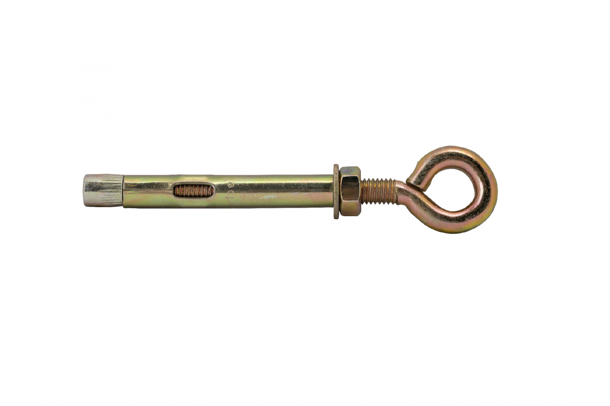 На конце болта расположено кольцо. При монтаже оно служит опорой для вертикально закрепляемого груза. Метод, как установить анкерный болт с кольцом, не отличается от технологии монтажа предыдущих видов крепежа. Анкер устанавливается в просверленное монтажное отверстие. При закручивании стержня втулка распирается и надежно фиксируется в теле материала.