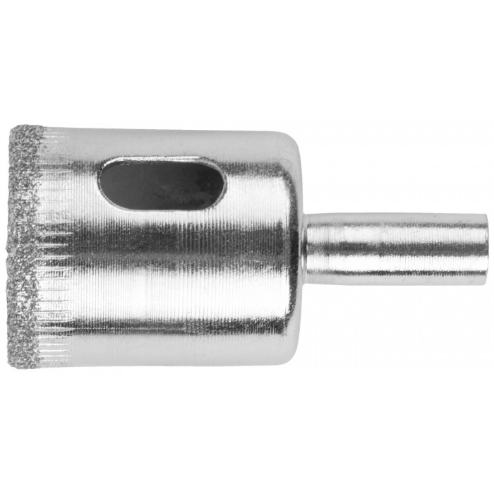 Цилиндрический хвостовик. Для вырезания круговых отверстий в кафеле и стекле. Влажное сверление. Материал инструментальная сталь, режущая кромка содержит порошок из технических алмазов.