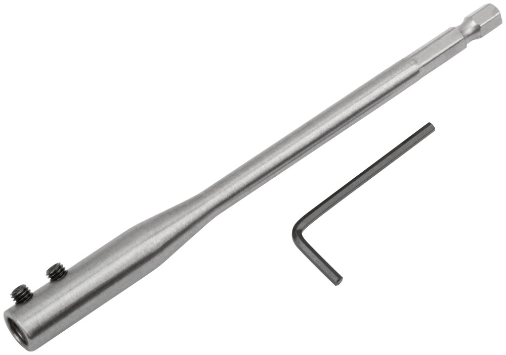 Удлинитель для перовых сверл станет идеальным дополнением к вашему набору инструментов. Он имеет длину 150 мм и ключ для легкой установки и демонтажа. Он изготовлен из прочных материалов, которые выдерживают интенсивное использование, что делает его хорошим выбором для любой работы. Благодаря своему тонкому дизайну этот предмет может поместиться в ограниченном пространстве, позволяя вам работать в труднодоступных местах. Удлинитель для перовых сверл обязательно облегчит и повысит эффективность вашей работы.