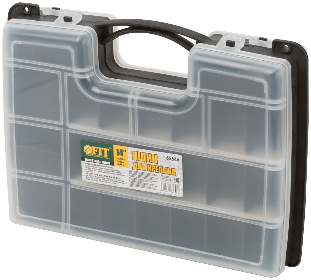 Двусторонний ящик-органайзер FIT 65646 выполнен в форме кейса, служит для хранения и переноски крепежных изделий. Имеет 22 отделения с одной стороны и 10 с другой, где удобно размещаются необходимые аксессуары и различные мелочи. С помощью переставных перегородок можно регулировать размеры ячеек, чтобы максимально эффективно использовать имеющееся внутри пространство. Прозрачная крышка позволяет видеть расположение крепежа внутри. Две пластиковые защелки надежно защищают чемоданчик от непреднамеренного открывания.