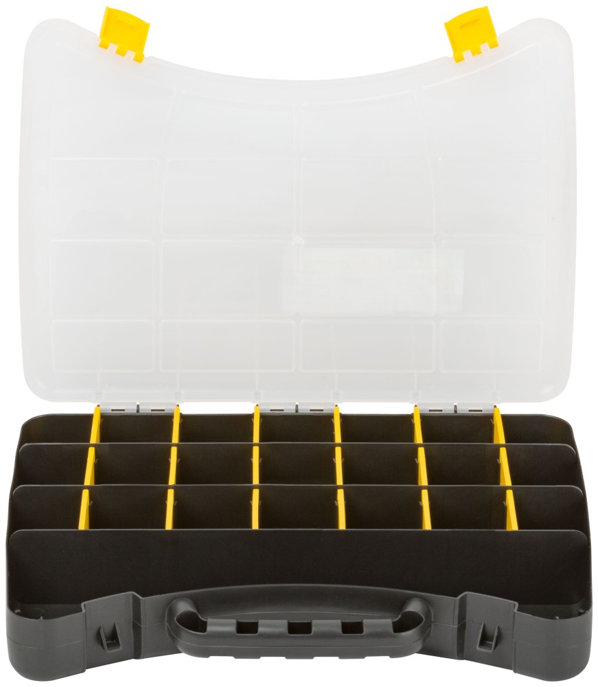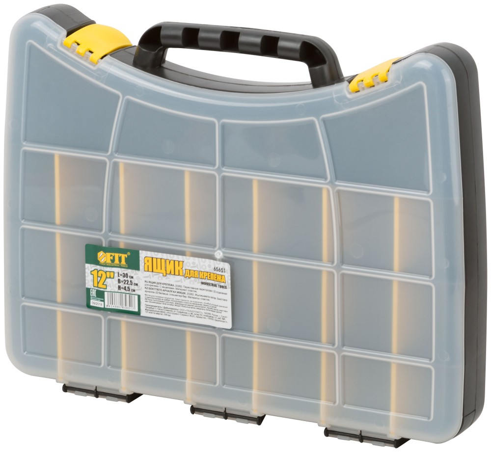 Пластиковый ящик FIT 65651 выполнен в форме кейса, служит для хранения и переноски крепежных изделий. Состоит из 22 отделений, где удобно размещаются необходимые аксессуары и различные мелочи. С помощью переставных перегородок можно регулировать размеры ячеек, чтобы максимально эффективно использовать имеющееся внутри пространство. Прозрачная крышка позволяет видеть расположение крепежа внутри. Две пластиковые защелки надежно защищают чемоданчик от непреднамеренного открывания.