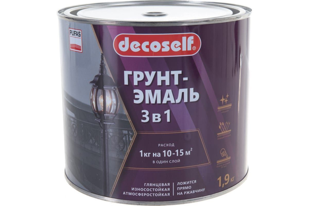 Грунт-эмаль Pufas Decoself 3 в 1 применяется для окрашивания изделий из металла с толщиной ржавчины до 0.1 мм. Подходит для нанесения на гаражи, автомобили и металлические конструкции. Свойства продукта: - Не надо очищать и грунтовать поверхность; - Имеет в своем составе антикоррозийные пигменты и преобразует ржавчину; - Первый слой является грунтом матового цвета, второй слой дает полуматовый эффект; - Отличает высокая адгезия, легко ложится на металл с гладкой и прокорродированой поверхностью. Обладает антикоррозийными свойствами, атмосферостойкостью и влагостойкостью. Быстро высыхает. Покрытие полностью высыхает за 24 часа.