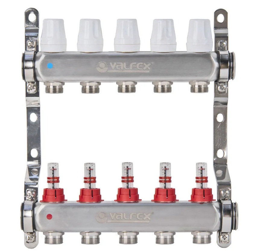 Коллекторная группа из нержавеющей стали со встроенными расходомерами и регулирующими клапанами ТМ VALFEX – позволяет производить балансировку петель при включенном циркуляционном насосе с помощью настроечных клапанов без фиксации, с расходомерами. В комплекте имеются автоматические воздухоотводчики, позволяющие удалять из системы накопление воздуха и газов.
